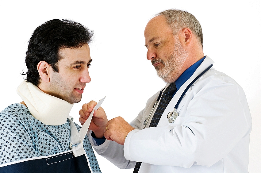 Patient with broken hand sitting in hospital is being examined by doctors and are giving a prescription to her